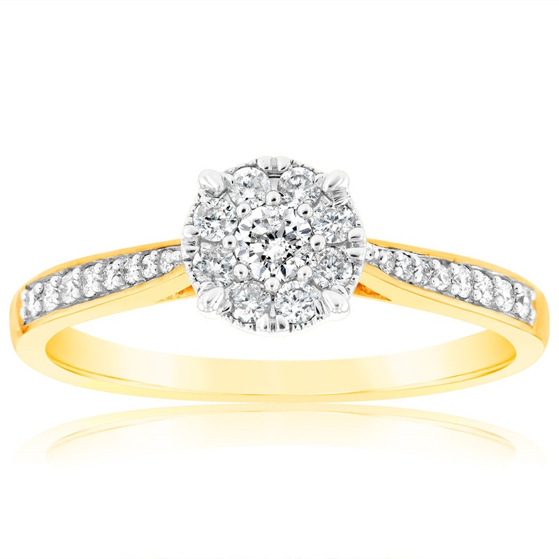 This fascinating 9ct Yellow Gold Ring With 1/3 Carats Of Diamonds has all the flicker and gleam youd expect from a scintillating diamond piece. This cluster of exquisite gemstones is perfect to take out under lights or the sun where it will sparkle from ev