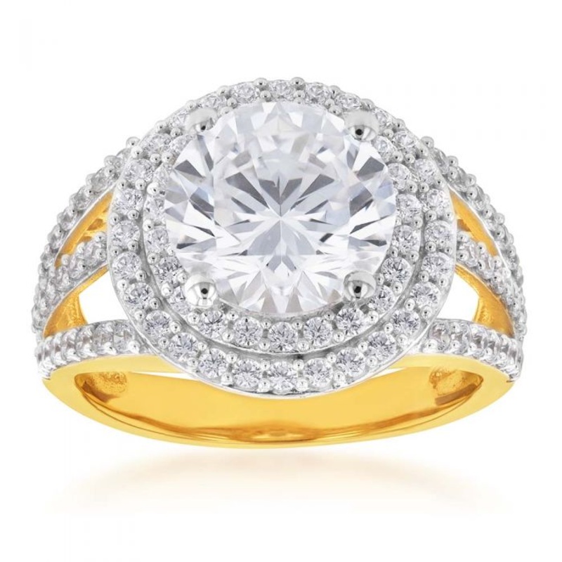 9ct Yellow Gold Round Double Halo Zirconia Split Band Ring