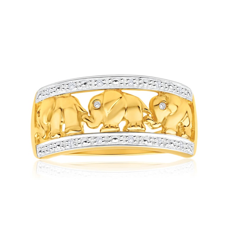 We love this unique elephant ring. Crafted in 9ct yellow gold, the cocktail ring features 5 points of sparkling diamonds.