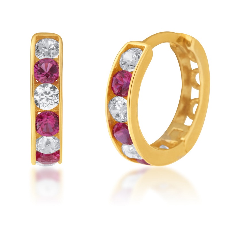 A quintessential accessory to complete your jewellery collection, this beautiful Huggies Earrings made with 9ct Yellow Gold and set with a White and Red Cubic Zirconia will add both elegance and sparkle to your outfits. Huggie earrings are extremely on tre