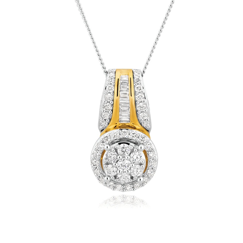 Feel precious in this adorable 9ct Yellow Gold & White Gold Diamond Pendant With Chain. This smooth design has classic style, with flowing yellow gold make and glamourous diamonds highlights. This pendant holds a collection of brilliant and baguette cut st