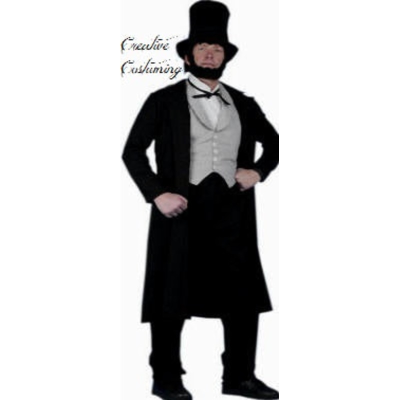 Includes: Black 3/4 length jacket, grey vest with attached shirt front / dickey with string tie, matching pants, black stovepipe hat and beard.circa 1861-1865Size (Chest): M (40-42")Color: BlackPA6697 Adult / PA6697 C Child