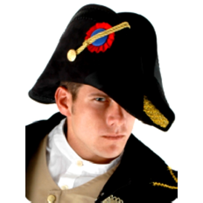 This authentic bicorn is modeled after hats worn by military & naval officials in the late 18th century.Made of pressed EVA, covered in black ultra suede, complete with ornate gold detailing, gold button &red satin ribbon medallion.There is a hidden pocket inside the hat.Costume suggestions: French Soldier, Napoleon Bonaparte.