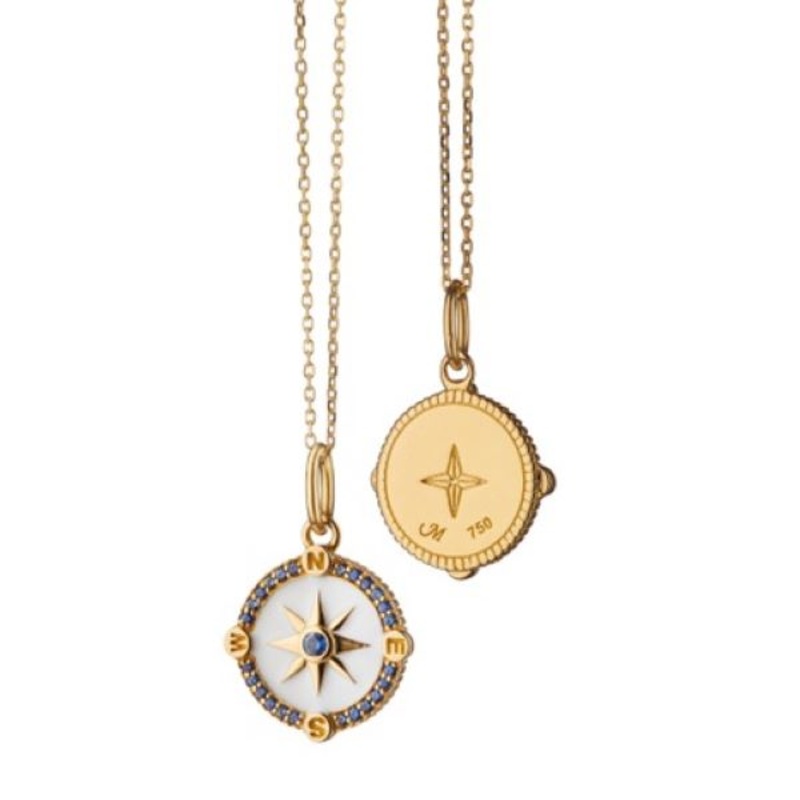 This 18 karat yellow gold Monica Rich Kosann mini “Adventure” compass charm features round blue sapphire, white enamel, and comes with a 17 chain with a jump ring at 16 inches.