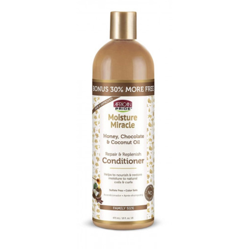 AFRICAN PRIDE MOISTURE MIRACLE HONEY, CHOCOLATE & COCONUT OIL CONDITIONER is a moisture-restoring blend that combines the natural conditioning benefits of honey and coconut oil with the restorative effects of cocoa. This blend helps to transform dry coils and curls, restoring and repairing while replenishing moisture and leaving them hydrated and nourished.