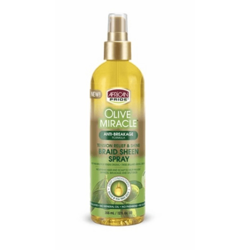 African Pride Olive Miracle Braid Sheen Spray offers superior protection for locks and twists, with extra virgin olive oil to nourish and hydrate the scalp. The anti-breakage formula reduces split ends and dryness, ensuring healthier hair growth and a smoo