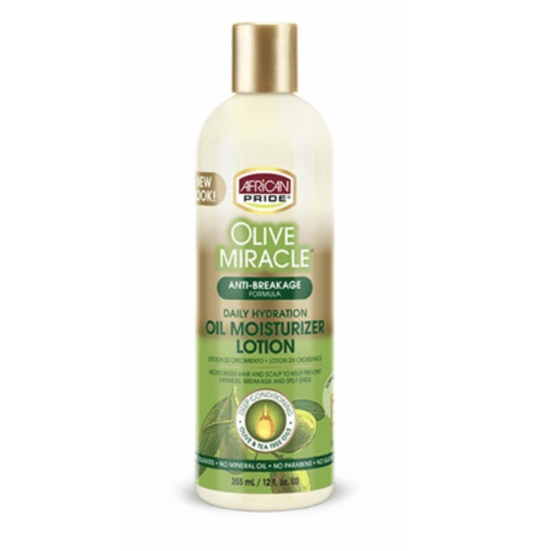 African Pride Olive Miracle Moisturizer Lotion locks in moisture to promote a healthy sheen and keep hair conditioned, reducing the risk of breakage, split-ends, and dryness. Formulated with Extra Virgin Olive Oil, it is a non-greasy solution to get silky,
