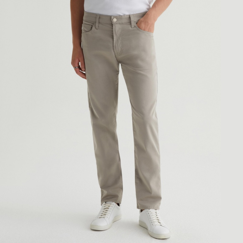 AG Tellis in Dry Dust.The Tellis is a modern slim fit updated in our new 10 oz. Commuter Performance Sateen with premium stretch for enhanced mobility. Featuring a fitted upper block and tapered leg opening, this five-pocket pant features a light beige sha