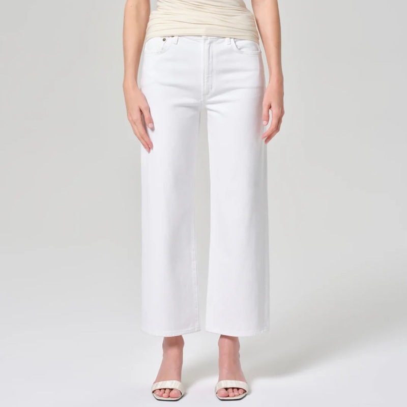 AGoldeE Harper Crop Jean in Sour Cream. The Harper Crop is crafted from recycled cotton with just the right amount of stretch for comfort. Featuring a relaxed mid-rise fit, it has a flattering square top block and a straight, subtly cropped wide leg. Made
