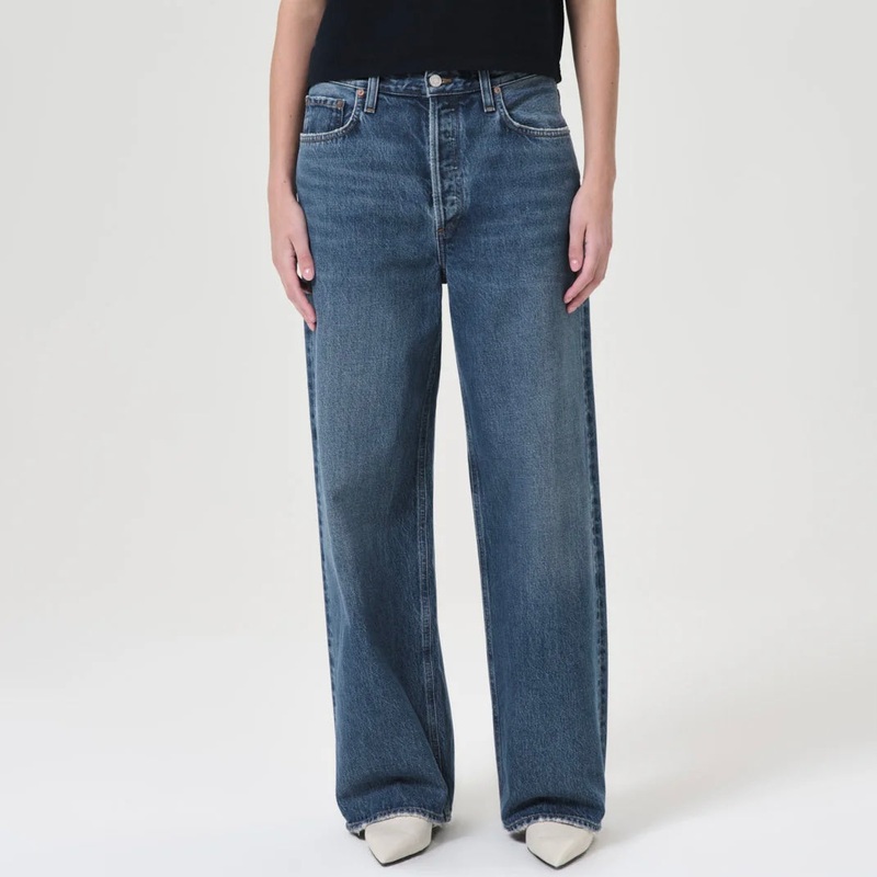 AGoldE Low Slung Baggy in Essence. Designed for comfort and style. Our Low Slung Baggy features an ultra-relaxed yet ultra-flattering silhouette. This upsized fit sits low on the hips with a directional, baggy straight leg. Cut with a longer inseam and cra