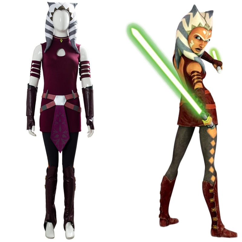 Ahsoka Tano Cosplay Costume MaterialCotton Blend + Garment Leather + Milk Protein Fiber + Polyester Package included: Armband*8 + Belt + Glove*2 + Necklace + Shoe Cover*2 + Top + Trousers + HeadgearShipping:Processing time 7-15 days. (Female Size XS, S, M,