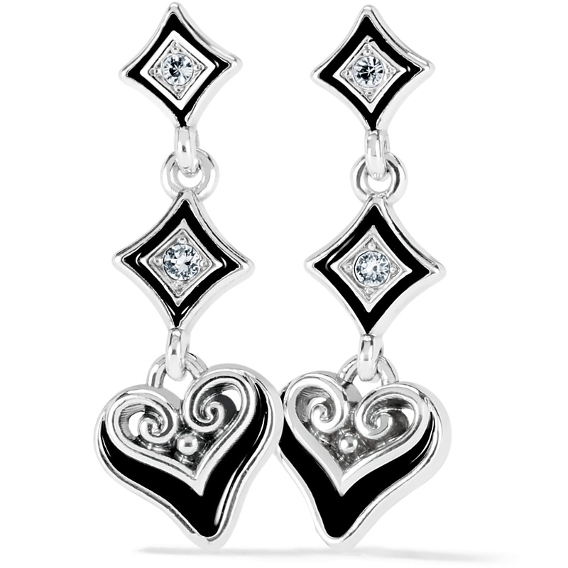 Featuring fine quality crystals atop swirly filigree hearts, these sweet silver-plated earrings with hand-enameled details are perfectly Brighton in every way.