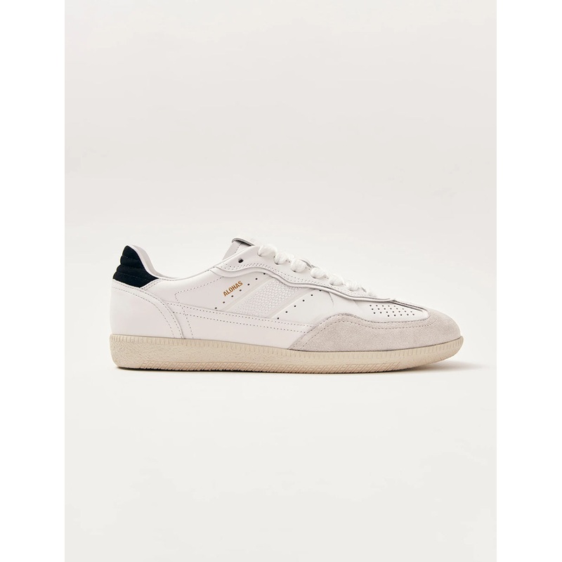 A mix of white leather and suede, finished with grey and black trims. Designed with a low-top silhouette, white laces, and a rubber sole create a classic with a fresh feel. By ALOHAS Rubber sole Lace styling Low-top silhouette