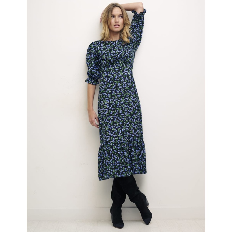 Another Selena day dress for your collection refreshed in a sweet blue cherry print . Its softly shaped with elbow sleeves and a floaty hemline. Wear it with trainers, chunky boots or heels.Round neckElbow sleevesCurved underbust seamKeyhole back button fa