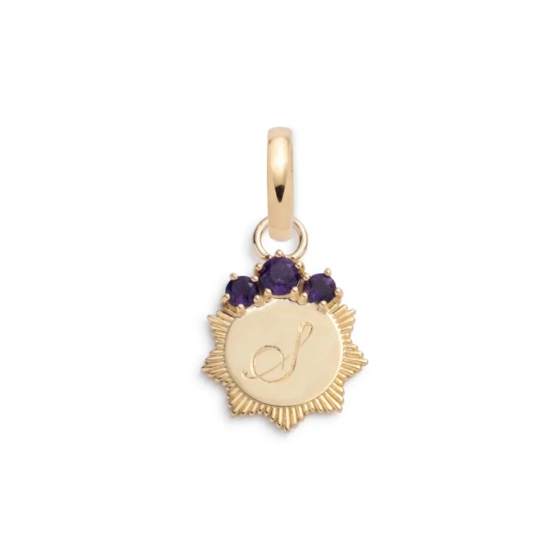 DescriptionCrafted in 18k yellow gold, this customizable Amethyst Engravable Miniature Medallion features a hand-engraved initial or other letter at the center topped with three amethyststhe birthstone for those born in February. Because of its beautiful v