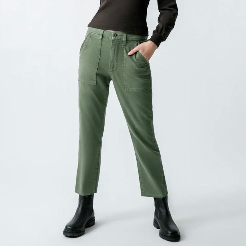 AMO Easy Army Trouser In Tea Leaf. BEST SELLER!Recommend sizing down.The EASY ARMY TROUSER is a slightly relaxed, crop straight pant with trouser styling and a single button with zip fly enclosure.Features back and front army patch style pockets.Just like