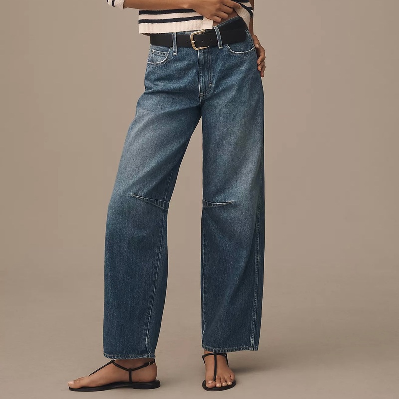 AMO Sandra Baggy Jean in Emotion. Crafted from premium rigid denim these low-rise jeans are designed to sit low on the hip for an effortless look. With a loose fit through the hip and thigh, they offer both comfort and a relaxed vibe. The wide straight leg, knee dart detail, and full inseam create a curved, authentic look. Zip fly.