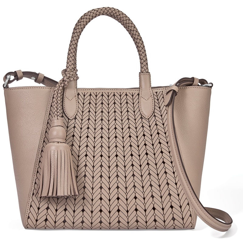 It's easy to fall in love with this luxe tote inspired by the laid-back lifestyle of Santorini. A sumptuous tassel and braided handle add visual balance to the die cut and laser-etched leather. Carry it by its top handles or long strap.