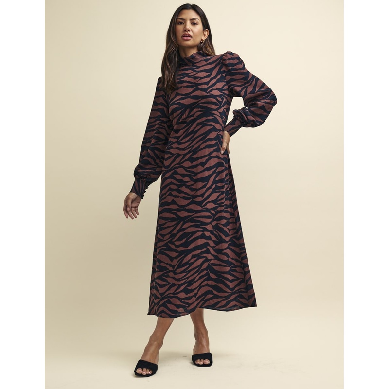 Trends come and go but nothing replaces a great dress. Cut with a high neck and long balloon sleeves, this tiger stripe midaxi will take you everywhere this autumn. Lucinda includes an open back fastened by two fabric covered buttons. Style yours with mules.