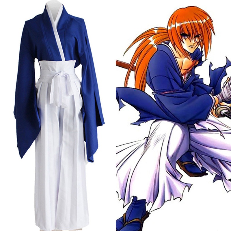 Anime Rurouni Kenshin Himura KENSHIN Blue Kendo Kimono Cosplay CostumeMaterial:PolyesterIncluding:top + pants + beltSize chartSize/cmLengthBustSleeveWaistPant lengthHeightS70936069100160M731016374103165L761096678106170XL791176982109175