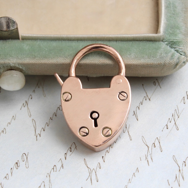 An antique heart-shaped padlock is a true must-have for every necklace lover’s collectionThis one is crafted in solid 9k rose gold and letter dated on the back for 1902, it works as either a charm or a chain clasp: perfect for connecting two shorter chains to wear as one necklace.