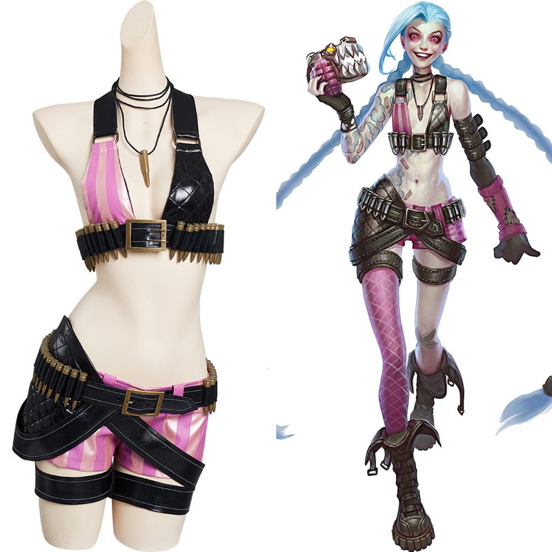 League of Legends - LoL Jinx Skin Halloween Carnival Suit Cosplay Costume OutfitsMaterial: Elastic Knitted Fabric + Faux LeatherPackage included: Arm Sleeve + Bottoms + Leglet*2 + Necklace + Stocking + Tube top + Wristlet*4 + Gloves