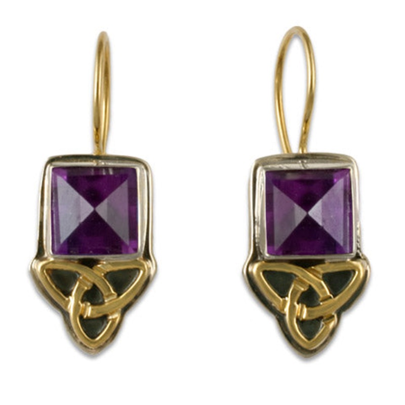 Helen's Aria Square Earrings, shown here with iolite, define understated elegance, these earrings can be worn on any occasion, the trinity 14k knot symbolizes the ancient Celtic mythology of the maiden, mother and crone; earth, heavens and the underworld;