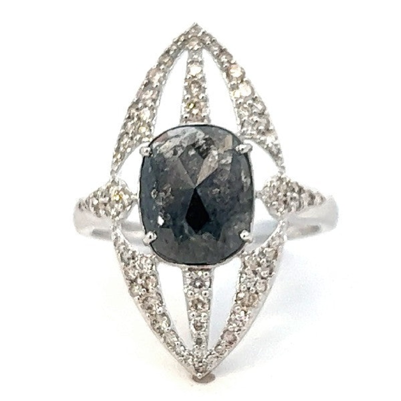18K white gold ring with a 2.13 ct black rose cut diamond and white diamonds 0.35cttw.
