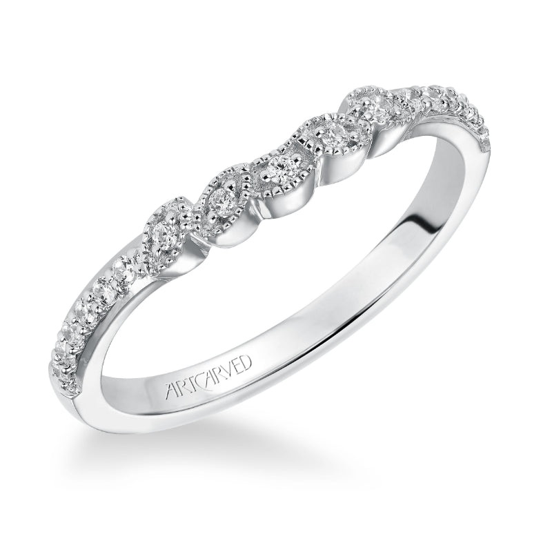 Wedding Band With Diamond Enhanced Petal Details And Round Prong Set Diamonds Halfway Around.
