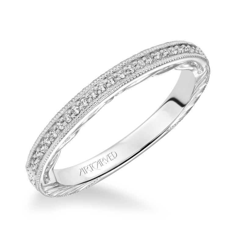 Artcarved Bridal Mounted with Side Stones Vintage Filigree Diamond Wedding Band Lavinia 14K White Gold
