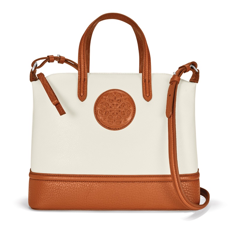 A roomy silhouette in a classic two-tone spectator design? What's not to love about this ladylike top handle bag that also includes a crossbody strap?!Color: White-CognacWidth: 12"Height: 8 1/2"Depth: 5"Weight: 2.25 lbsStrap: 4"Additional Strap: 23" - 26"