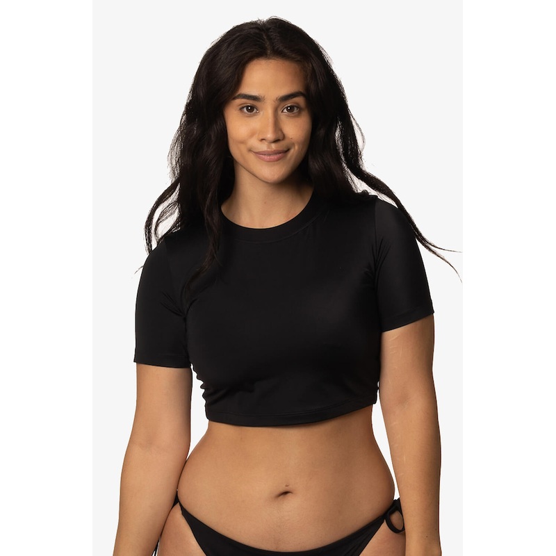Stay UV-ray protected and go all day long in the Aurora short-sleeved rashguard. The Aurora rashie is the perfect cropped rashguard for every closet. This cropped rashguard is great over any bikini top but is also double-layered so you can wear it as a top