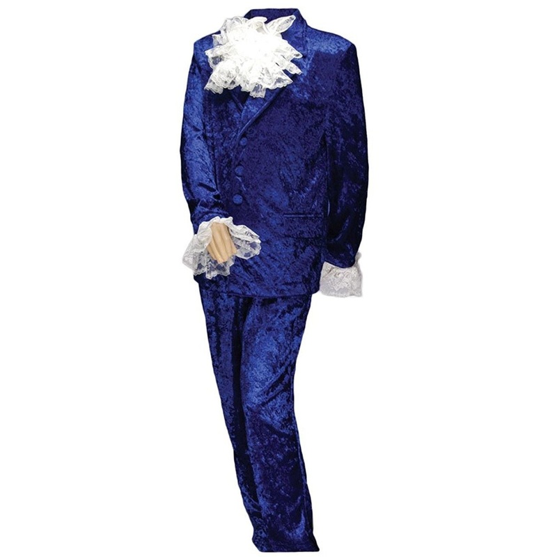 Includes: Iconic Velvet jacket with front covered button closure and mock pocket flaps, matching pants with seam pockets, contrasting lace jabot and cuffs.Made in USA /High-quality fabricColor: Blue, RedSize (chest): S (34-36), M (38-40),L (42-44), XL (46-