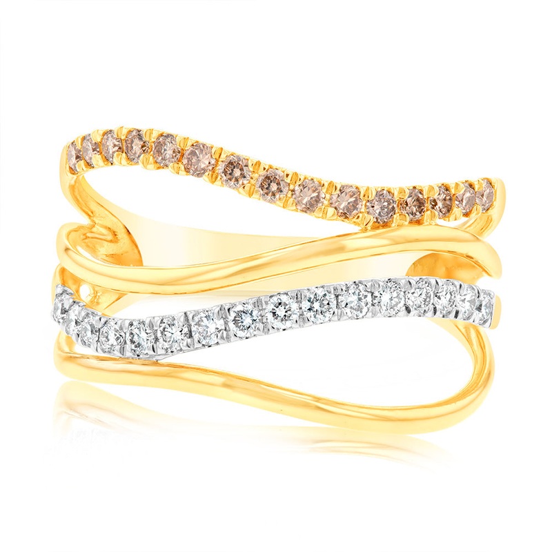 Designed to wrap gracefully around your finger, this Australian Diamond 9ct Yellow Gold Diamond Ring Futura is truly elegant. A mixture of Australian and clear diamonds offers excellent contrast, and accentuates the beauty of each gemstone colour. This stunning ring is woven from 9ct yellow gold, with a stripe of white gold resting under the clear diamonds for a striking effect.