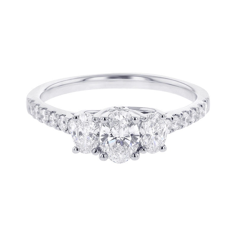 Ready for Love? Well take it a step further with Autumn. Classic three stone oval cut diamonds are set in 14 karat white gold to represent your past, present, and future as husband and wife. What could be better than that?