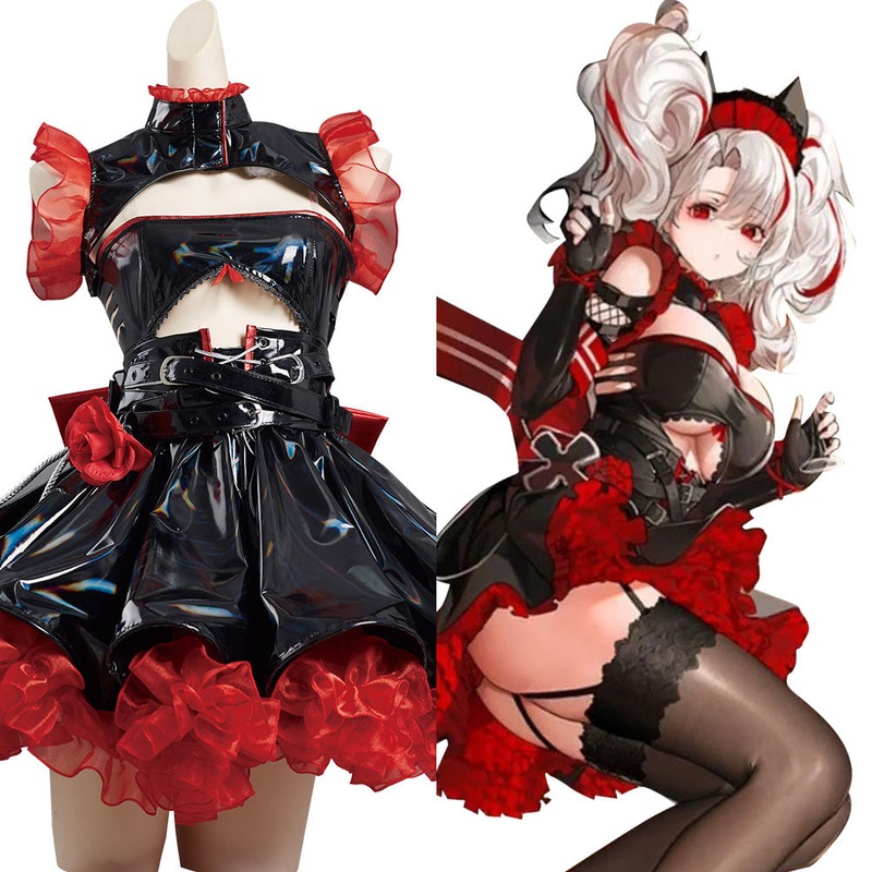 Azur Lane -Prinz Adalbert Maid Dress Halloween Carnival Suit Cosplay Costume OutfitsMaterial: Patent leather + Elastic Cloth + YarnPackage included: Dress + Gloves + Top + Bustle + Back Bowtie Decor + Waist Decoration*3 + Wristlet*2 + Belt*3 + Stockings +