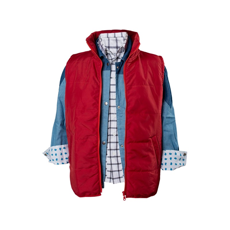 Back To The Future Marty McFly Cosplay CostumeMovie: Back To The FutureCharacter: Marty McFlyFabric: PolyesterIncluding: waistcoat, inner shirt, shirtSize chart:SizeChestinch)Waistinch)Sleeve lengthinch)S34-3628-3031.5-32M38-4032-3432.5-33L42-4436-3833.5-3