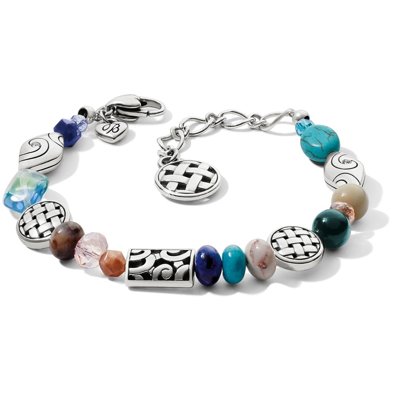 Finished with colorful stone beads and crystals, this silver bracelet adds a pop of casually beautiful color to your look.