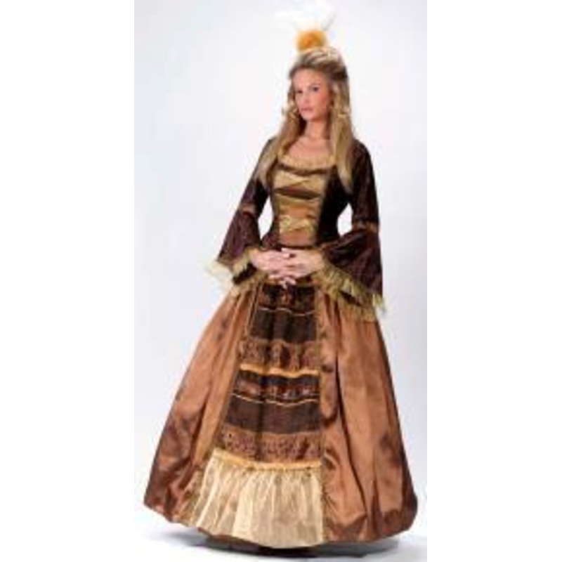 Circa 1400's to 1500's.Baroness costume for English Renaissance times.Includes: Beautiful full-length multi-tone brown velvet & taffeta dress with gold mesh ruffle trim, attached black tulle under skirt, attached hoop skirt & feather plum headpiece.Color: