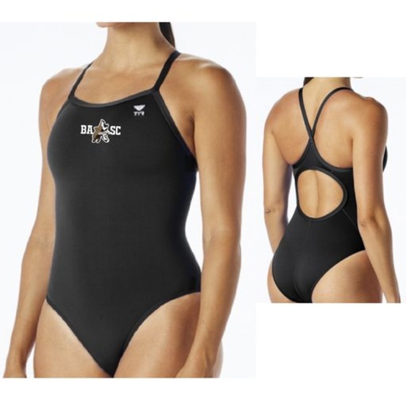 Featuring a medium neckline, sleek/flexible straps, keyhole back, moderate cut leg.BASC Logo on chest - FINAL SALE