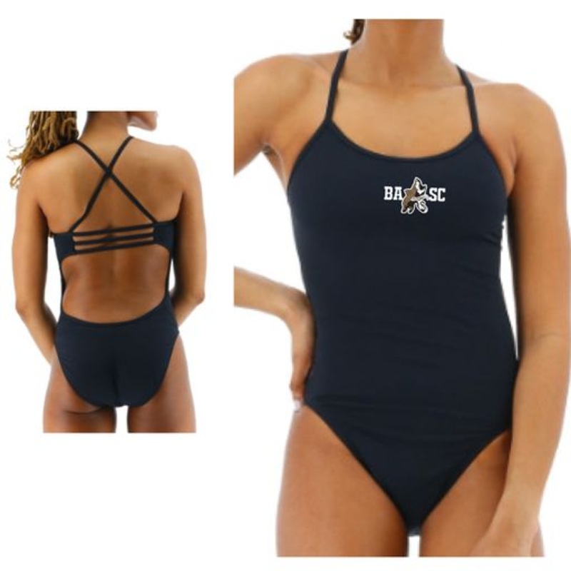 Featuring a medium neckline, sleek/flexible straps, open, triple-bound X-back, and high cut leg. All Durafast One suits are chlorine proof and sustain an impressive 300+ hours of performance.BASC logo on center chest - FINAL SALE