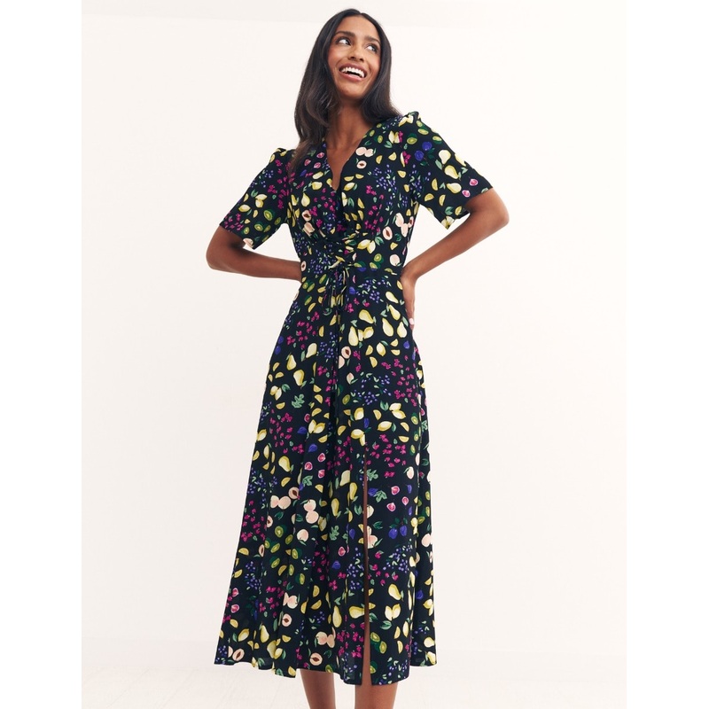 Our best-selling Beatrice dress has returned this time with an array of retro fruits. Featuring short sleeves and slim fit, this midi balances comfort and style thanks to the subtle leg slit, flattering frame and corset ties. Pair with anything from traine