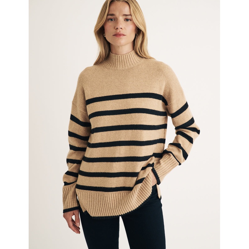 Make a cosy update to your current jumper collection with this beige and black striped layer. Your new go-to number features a funnel neck, voluminous sleeves and ribbed cuffs. Wear with denim or throw-on over your favourite midi.Funnel neckLong sleevesRib