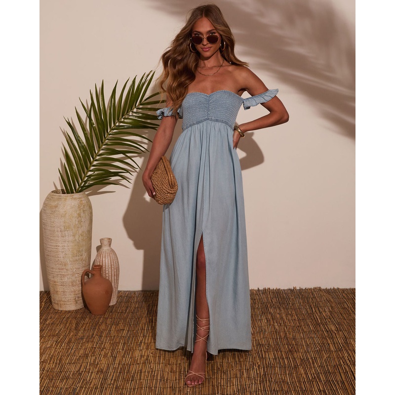 Perfect for those sunny vacation days, the Benitta Off The Shoulder Chambray Maxi Dress combines relaxed luxury with a touch of playful charm. The smocked bust and flutter sleeves create a flattering silhouette, while the pleated chambray fabric flows gracefully, catching the breeze with every step. Whether you’re on a tropical getaway or a chic staycation, the Benitta Maxi Dress promises vacation vibes and stylish ease in every wear.