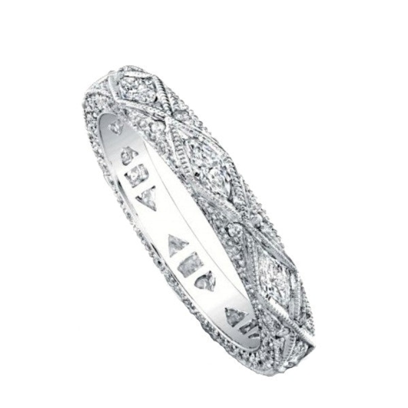 18K white gold eternity band features round & marquise shape diamonds accented with milgrain. The diamonds weigh a total of .96cttw. The ring is a size 6 1/2. Please contact us for other sizes. Pairs with Engagement ring 100-00103
