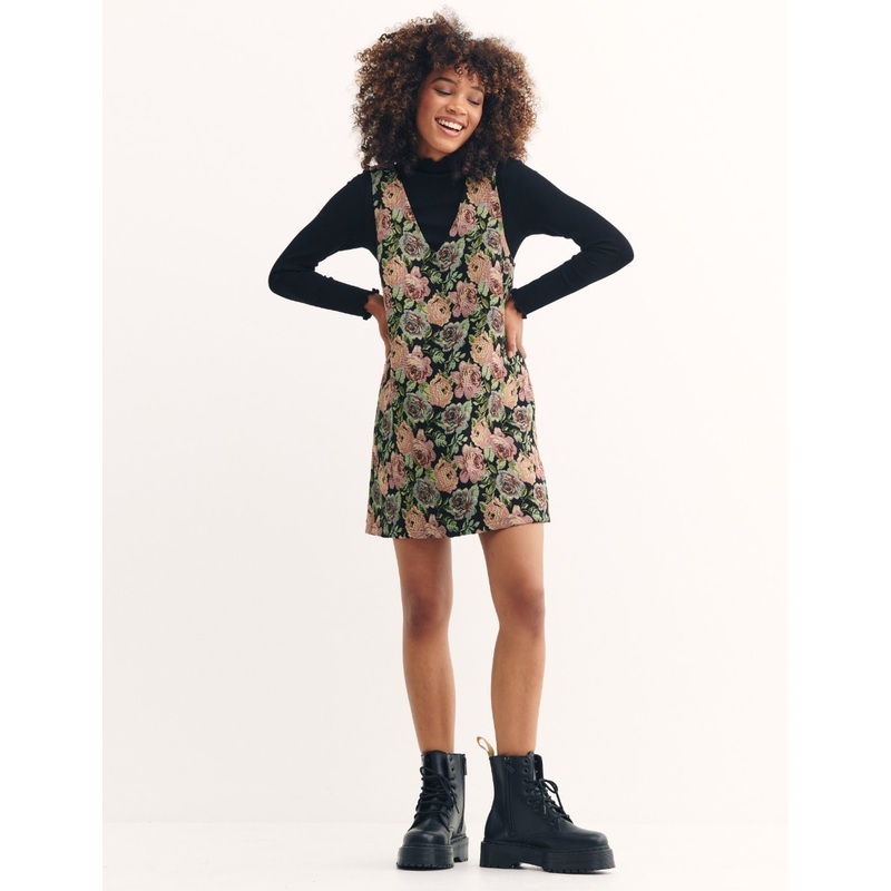 Give your next mini a touch of ancient history with the Billie pinafore. The dress is cut to a thigh-grazing length and is designed using a tapestry-inspired floral print. Featuring a V-neckline, the sleeveless dress is best paired layered over a long sleeve top and boots or trainers. It’s also available in curve sizing!