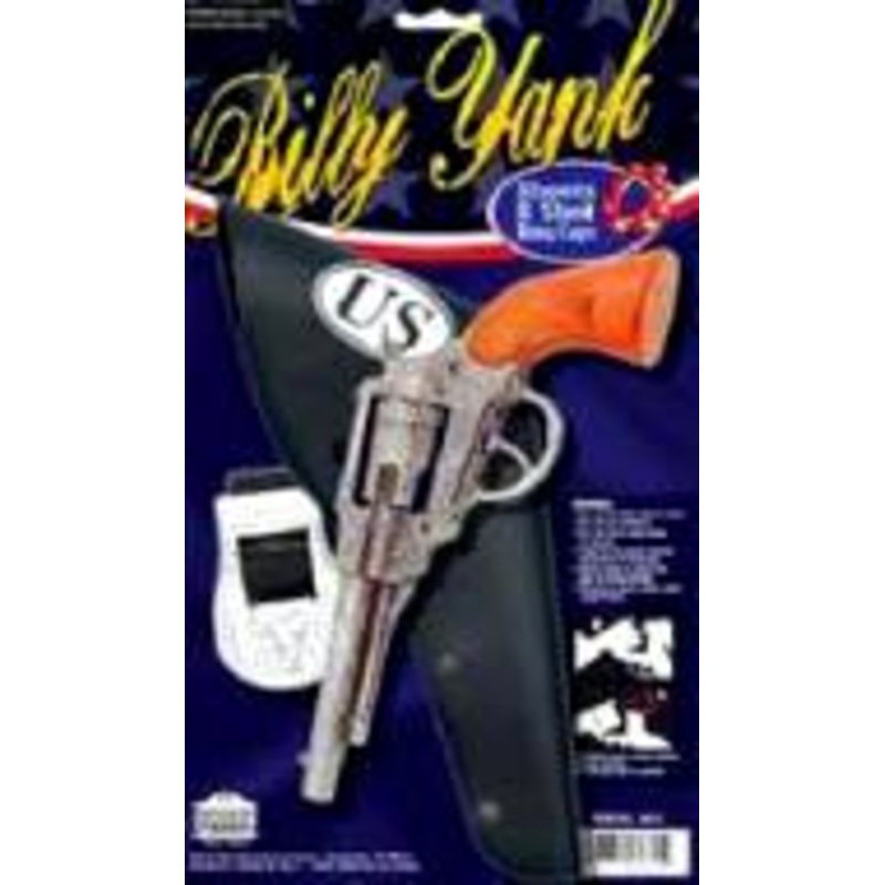 One Solid die cast metal 9.5" Long pistol.Made in Italy. Great Theatrical Prop.Includes: Pistol, Belt & Holster.Color: Antique Silver (shown)Size: One Size
