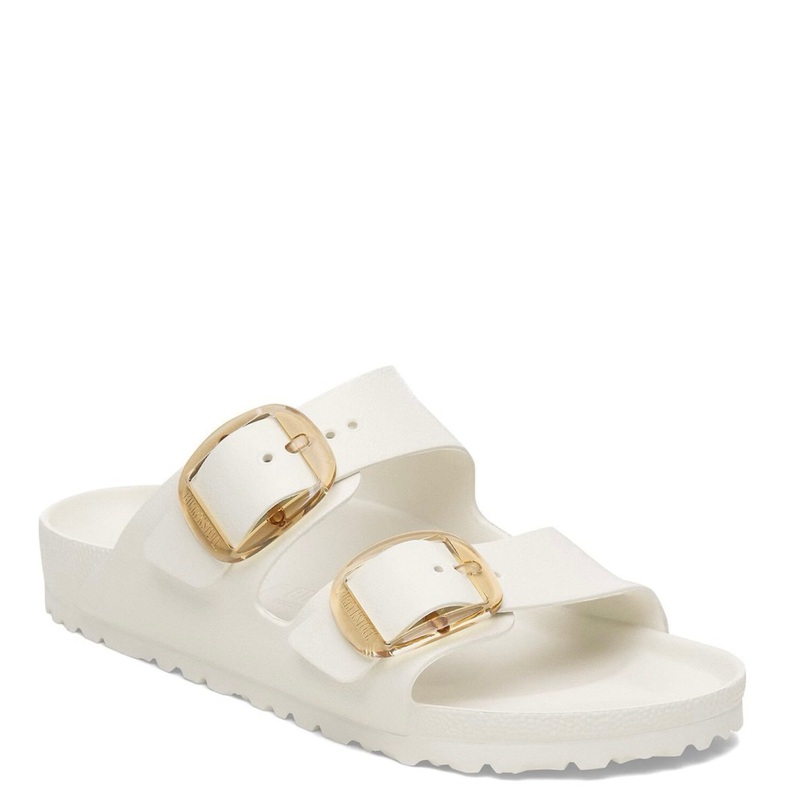 Birkenstock Big Buckle EVA in Eggshell. Big Buckle, big splash. Our water-friendly Arizona Essentials sandal, now with translucent big buckles. Lightweight, easy to clean and contoured with footbed support.Contoured footbed provides supportMade from one pi