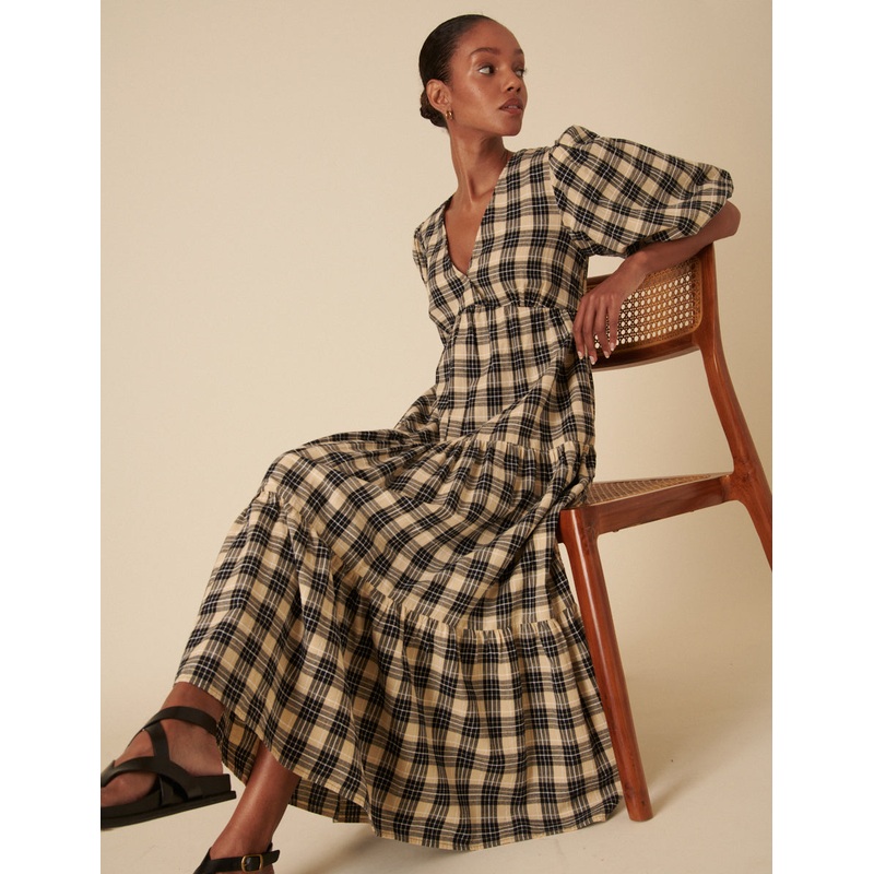 Be the first to review “Black And Beige Check Puff Sleeve Tiered Roselena Midi Dress”