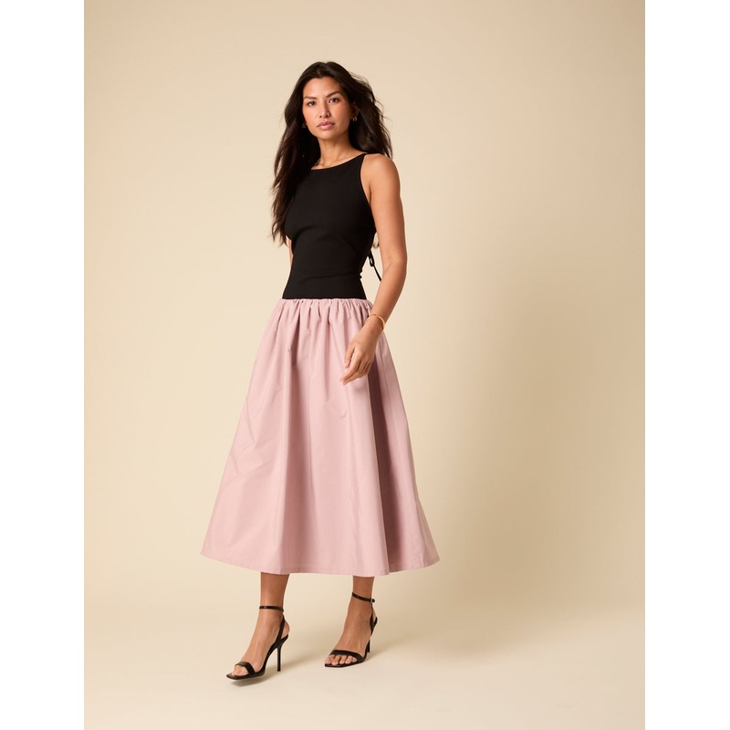This dress brings drama. With a black fitted bodice and blush-lavender skirt, we love the way it moves. The open back with tie detail? The cherry on top. High neck Concealed zip fastening Lightly lined so the fabric falls beautifully Designed to be semi-fi